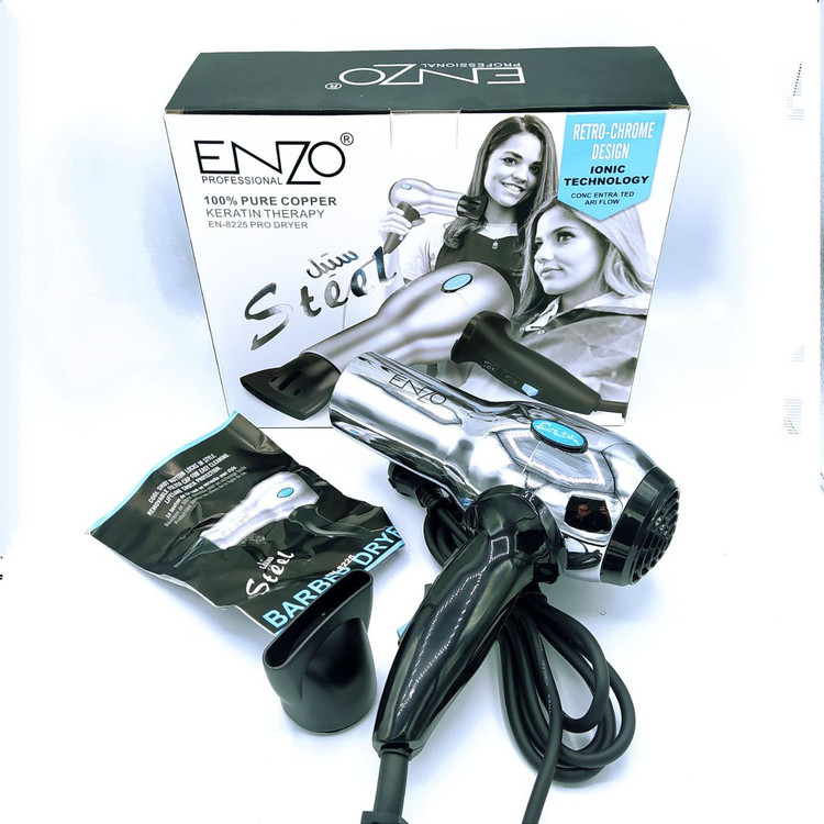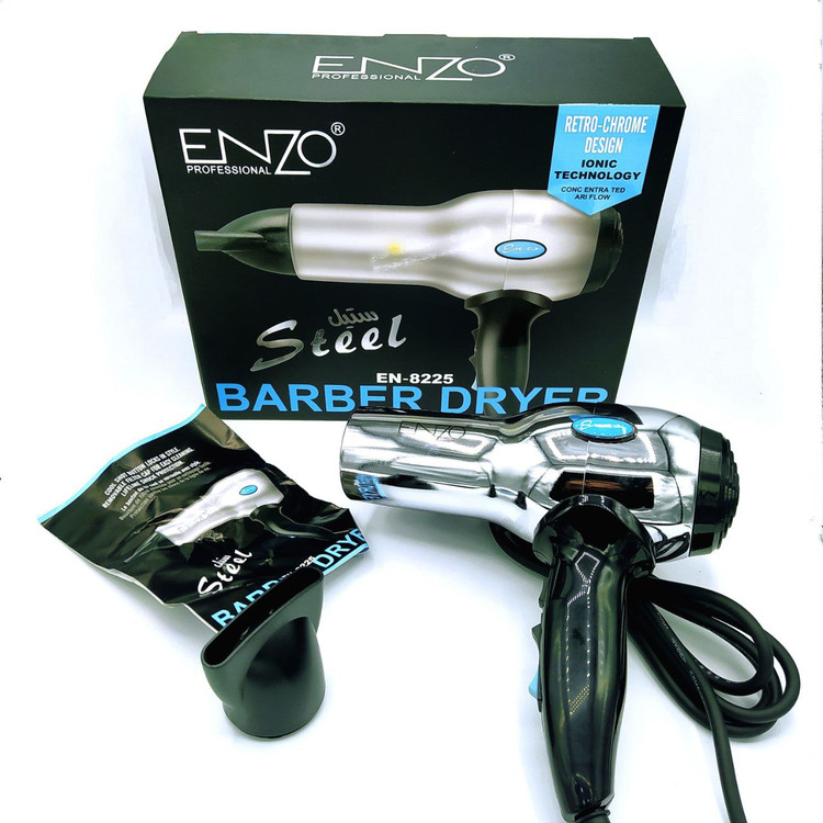 سشوار حرفه ای انزو ENZO EN-8225 ،اصل ایتالیا ،بدن استیل ،دارای دو جداری بدنه برای جلوگیری داغ شدن بدنه ،دارای فن هوشمند ،متور 21سیم پیچی ،دارای سرعت پرتاب باد 2500درثانیه ،گارانتی دار 24ماه ،قابل تعویض تا 12ماه ،قابل استفاده سالنی و خانگی ،المنت های ضد موخوره ,خوش دست ,قابل حالت گیر با پرتاب باد
