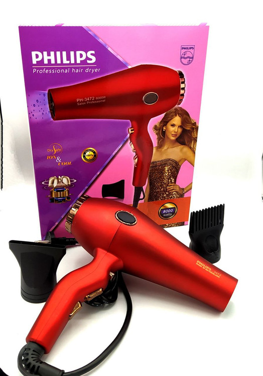 سشوار 8000 وات فیلیپس با فناوری خنک کننده موتور دیگر نیازی به خاموش کردن سشوار نیست و میتوانید در استفاده سالنی بدون دغدغه داغ شدن موتور استفاده کنید. سشوار فیلیپس مدل PH-3472 با سه حالت گرمادهی و دو سرعته قابل تنظیم است. سرعت پرتاب باد تا 110 کیلومتر بر ساعت میرسد. از دیگر ویژگی دیگر محصول صدای کم است حین سشوار کشیدن گوش شما را اذیت نکند. کابل ژله ای و 3.5 متری سشوار قابلیت فضای کار خوبی را به شما ارائه می دهد.