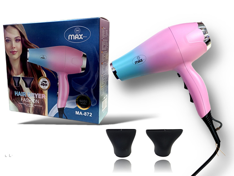 سشوار مکس max-872 موتور سنگین (موتور AC) برق المنت و موتور مجزا هست و به همین دلیل دو دکمه دارد یکی برای کنترل سرعت و دیگری برای کنترل درجه حرارت. دکمه کنترل حرارت دارای: باد سرد ، ملایم و گرم هست و همچنین به خاطر جدا بودن سیستم برقی، باد نیز به صورت خاموش کم و زیاد قابل تنظیم است این گروه حرفه ای هست و برای کار براشینگ مناسب می باشد