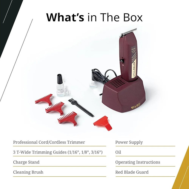 این ماشین اصلاح ساخت آمریکا به همراه ۳ عدد راهنمای اصلاح T شکل بسیار پهن (۱/۱۶ اینچ، ۱/۸ اینچ و ۳/۱۶ اینچ)، پایه شارژ خودکار، برس تمیزکننده، روغن تیغه ماشین اصلاح، محافظ تیغه قرمز و دفترچه راهنما ارائه میشود.